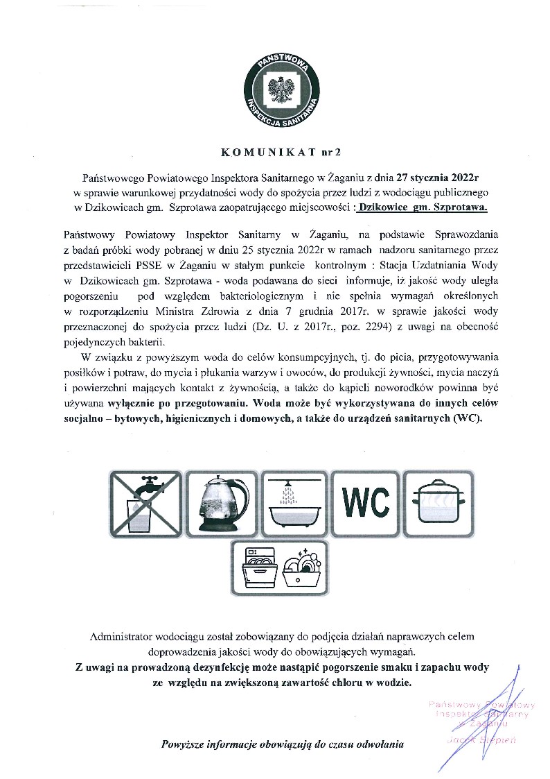 Zgodnie z Decyzją Państwowego Powiatowego Inspektora Sanitarnego w Żaganiu nr HK/4/36/2022 z dnia 27 stycznia 2022 r. informujemy, że związku z wykryciem pojedynczych bakterii z grupy coli na SUW w Dzikowicach od dnia 27.01.2022 r. do odwołania woda dostarczana siecią wodociągową jest warunkowo dopuszczona do spożycia wyłącznie po przegotowaniu.