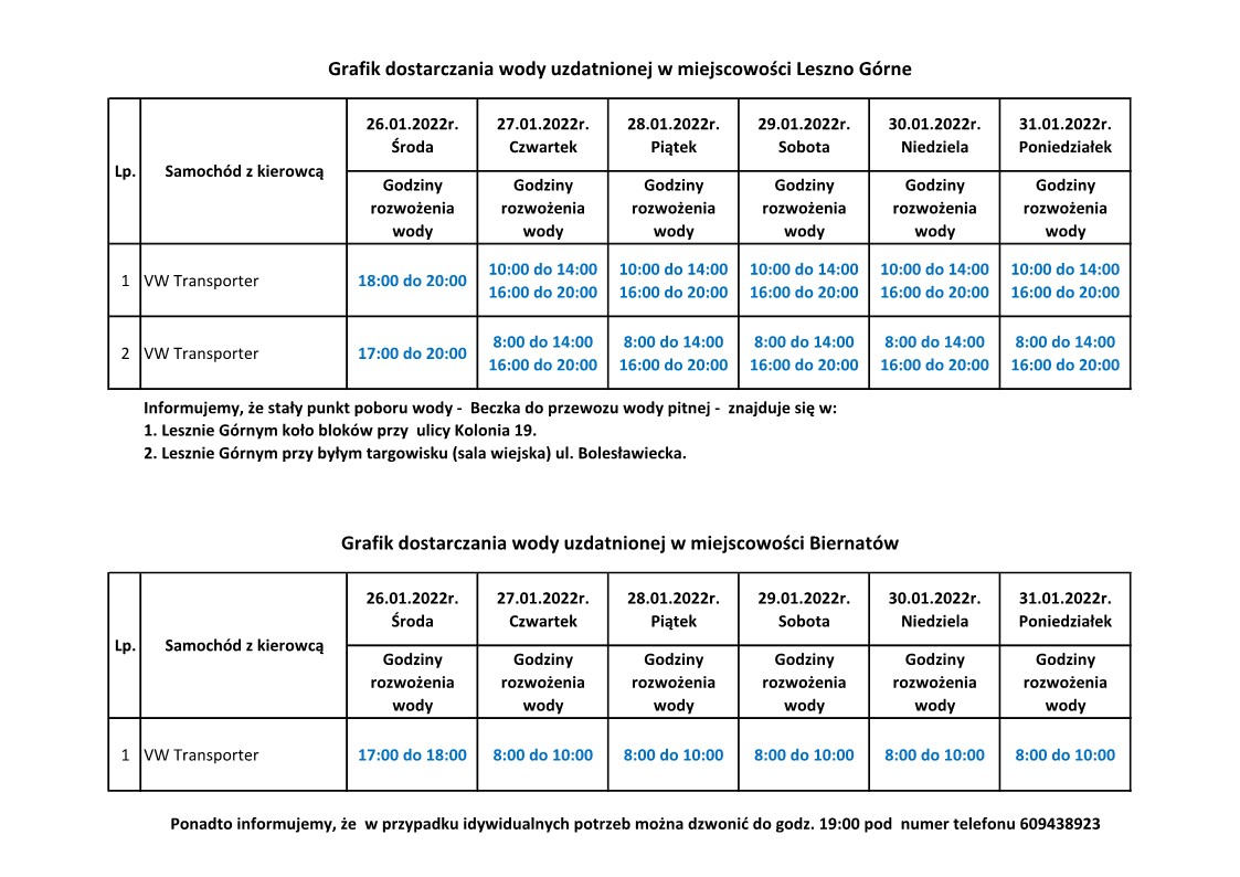 Do czasu uzyskania pozytywnych analiz wody uzdatnionej z sieci wodociągowej, woda przeznaczona do spożycia po przegotowaniu będzie dostarczana w stacjonarnych pojemnikach oraz beczkowozem do przewozu wody pitnej, zgodnie z grafikiem.