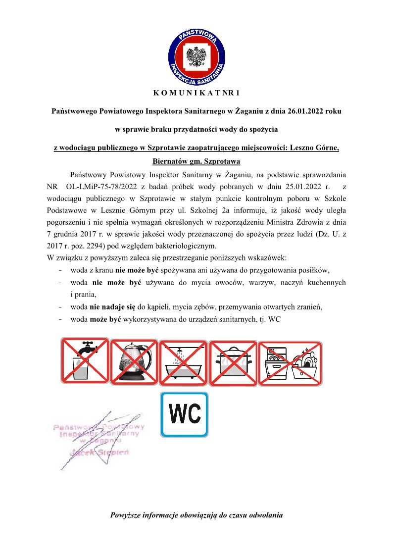 Zgodnie z Decyzją Państwowego Powiatowego Inspektora Sanitarnego w Żaganiu nr HK/35/3/2022 z dnia 26 stycznia 2022 r. informujemy, że od dnia 26.01.2022 r. do odwołania woda dostarczana siecią wodociągową nie nadaje się do spożycia i do celów gospodarczych, może być używana wyłącznie do spłukiwania urządzeń sanitarnych tj. WC.